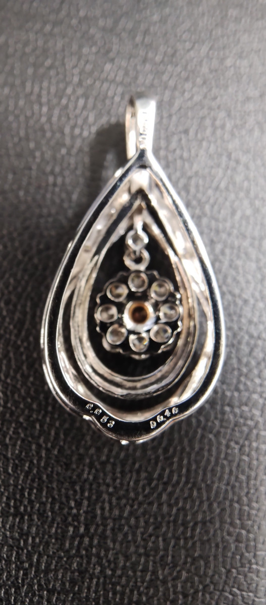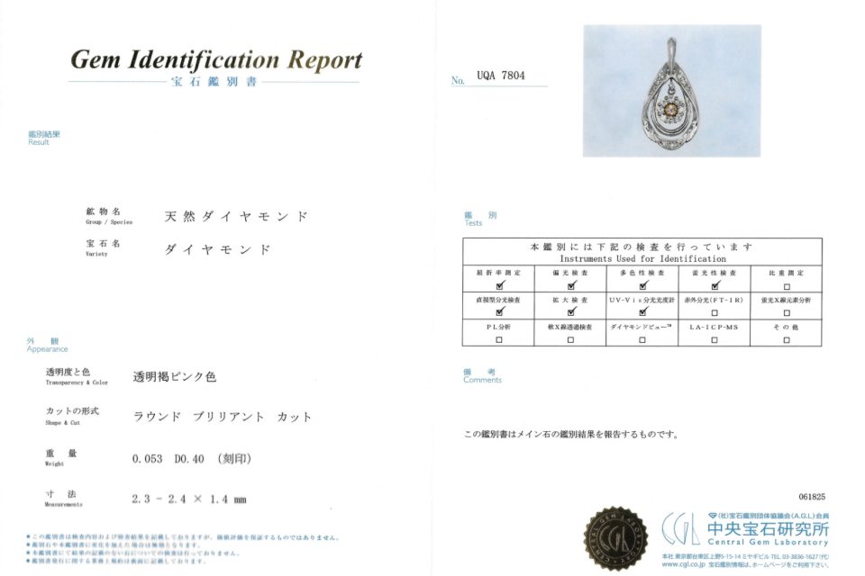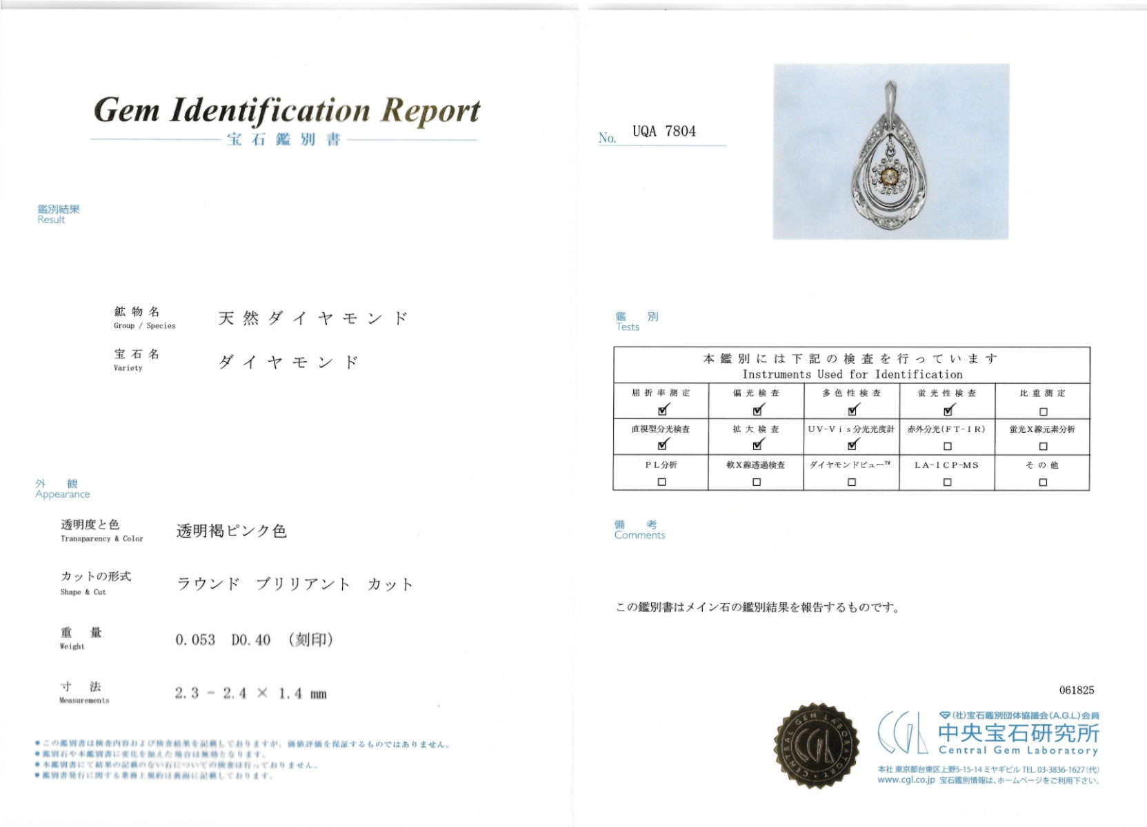 【ジュエリー】天然ダイヤモンドペンダントトップ 130,000円 2025/09/01 USED 天然ダイヤモンドペンダントトップ (褐ピンク色)CGL 鑑別書 USED 天然ダイヤモンドペンダントトップ(褐ピンク色)は、CGL鑑別書付きで品質が保証されています。上品な褐ピンクカラーが特徴で、特別な場面にも日常使いにも適したアイテムです。 総重量 5.58g サイズは(外枠部分) 縦約2.5㎝ 横約1.6㎝ (中枠部分) 直径約0.6㎝ 台座はPt900 商品購入はこちら